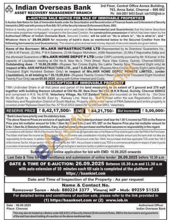 7/8th Undivided Share in all that piece and parcel of the land measuring to an extent of 3 ground and 270 sqft together with building thereon situated at Old No.59, New Door No.103, M.K.N Road, Guindy, Chennai 600032 and comprised in R.S. No.87/B, Velachery Village, No.137, Saidpet Taluk and bounded on the North by: Old Door No.58, South by Old No.60; East by: Railway Line, West by: M.K.N Road within the sub Registration District of Velachery and Registration District of South Madras. Property stand in the name of PMA Saleema and entire property is covered under Release Deed Doc No. 5716 of 2003 dated 29/12/2003 at SRO, Velachery.