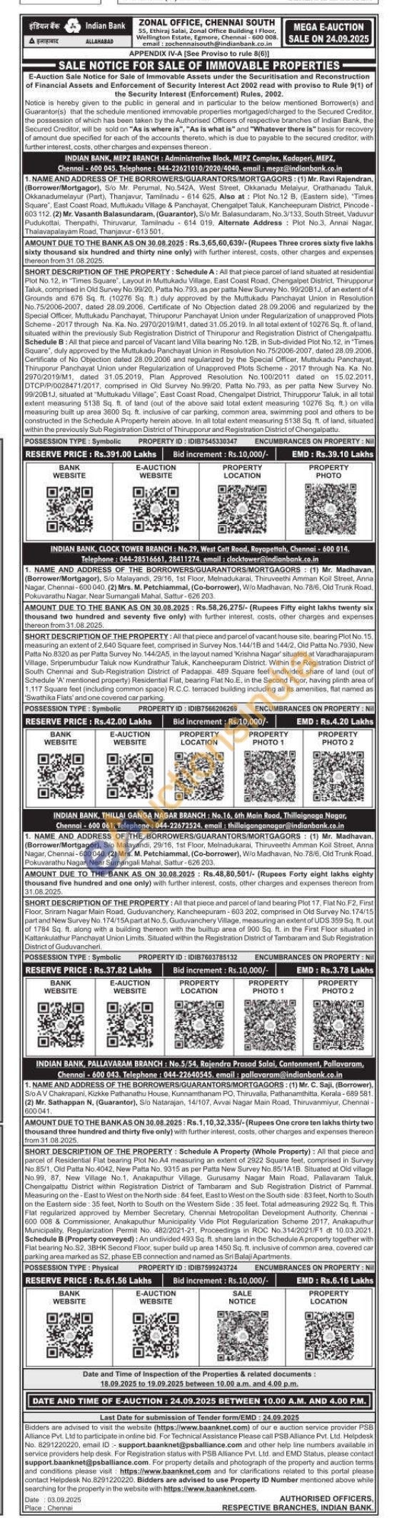 All that piece and parcel of Residential Flat bearing Plot No A4 measuring an extent of 2922 Square feet, comprised in Survey No.85/1, Old Patta No.4042, New Patta No, 9315 as per Patta New Survey No 85/1A1B. Situated at Old village No.99, 87, New Village No.1. Anakaputhur Village, Gurusamy Nagar Main Road, Pallavaram Taluk Chengalpattu District within Registration District of Tambaram and Sub Registration District of Pammal Measuring on the East to West on the North side: 84 feet, East to West on the South side 83 feet, North to South on the Eastern side: 35 feet, North to South on the Westem Side: 35 feet. Total admeasuring 2922 Sq. ft. This Flat regularized approved by Member Secretary, Chennai Metropolitan Development Authority, Chennai 600 006 & Commissioner, Anakaputhur Municipality Vide Plot Regularization Scheme 2017, Anakaputhur Municipality, Regularization Permit No. 482/2021-21, Proceedings in ROC No.314/2021/F1 dt 10.03.2021. Schedule B (Property conveyed): An undivided 493 Sq. ft. share land in the Schedule A property together with Flat bearing No. 32, 3BHK Second Floor, super build up area 1450 Sq. ft. inclusive of common area, covered car parking area marked as S2, phase EB connection and named as Sri Balaji Apartments.
