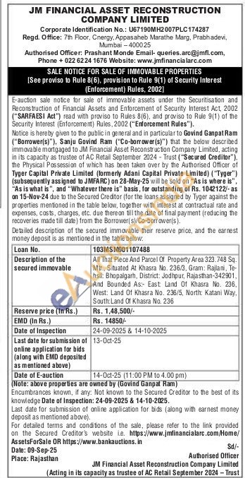 All That Piece And Parcel Of Property Area 323.748 Sq. Mtr., Situated At Khasra No. 236/3, Gram: Rajlani, Te-hsil: Bhopalgarh. District. Jodhpur, Rajasthan-342901. And Bounded As: East Land Of Khasra No. 236, West: Land Of Khasra No. 236/5, North: Katani Way, South: Land Of Khasra No. 236