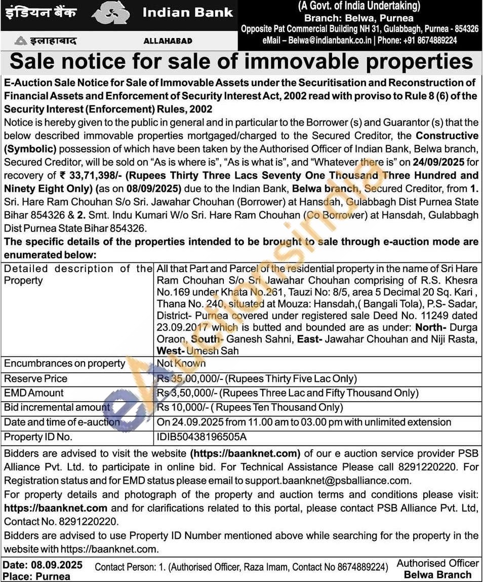 All that Part and Parcel of the residential property in the name of Sri Hare Ram Chouhan S/o Sri Jawahar Chouhan comprising of R.S. Khesra No. 169 under Khata No.261, Tauzi No: 8/5, area 5 Decimal 20 Sq. Kari, Thana No. 240, situated at Mouza: Hansdah, (Bangali Tola), P.S- Sadar, District- Purnea covered under registered sale Deed No. 11249 dated 23.09.2017 which is butted and bounded are as under: North- Durga Oraon, South- Ganesh Sahni, East- Jawahar Chouhan and Niji Rasta, West-Umesh Sah