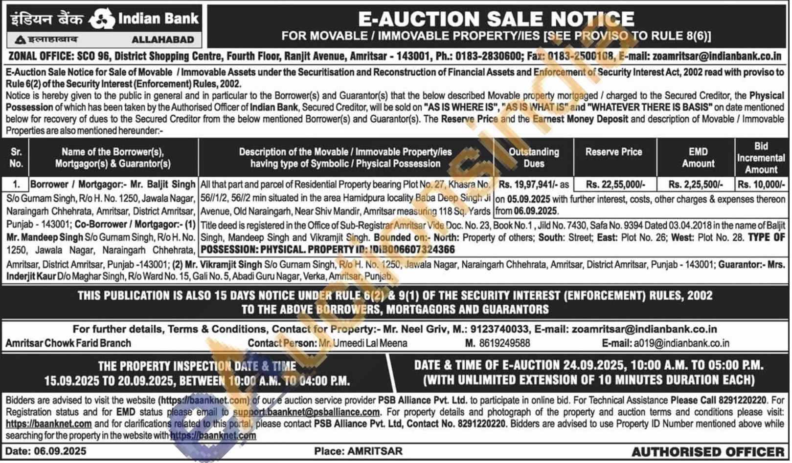 Amritsar Chowk Farid Branch Contact Person: Mr. Umeedi Lal Meena Μobile No : 8619249588 / Contact for Property:- Mr. Neel Griv Μobile No : 9123740033