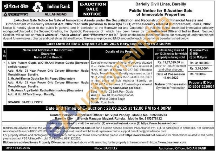 Equitable mortgage of the land/property situated at-House measuring 110.36 sq mts situated at H.No. 03 part of khasra no. 377-383 Biharman Nagla, Munshi Nagar Bareilly registered at bahi No. 1 Zild no 9689 pages 153-194 at SL No. 8301 in the office of sub registrar Bareilly on 27.10.2017 in the name of Punam Gupta Wio Anil Kumar. Property bounded as per deed:-