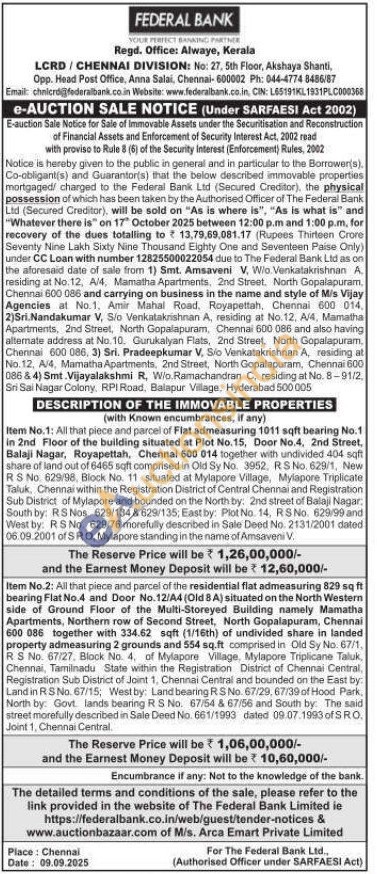 Item No.2: All that piece and parcel of the residential flat admeasuring 829 sq ft bearing Flat No.4 and Door No.12/A4 (Old 8A) situated on the North Western side of Ground Floor of the Multi-Storeyed Building namely Mamatha Apartments, Northern row of Second Street, North Gopalapuram, Chennai 600 086 together with 334.62 sqft (1/16th) of undivided share in landed property admeasuring 2 grounds and 554 sq.ft comprised in Old Sy No. 67/1, RS No. 67/27, Block No. 4, of Mylapore Village. Mylapore Triplicane Taluk, Chennai, Tamilnadu State within the Registration District of Chennai Central, Registration Sub District of Joint 1, Chennai Central and bounded on the East by Land in RS No. 67/15; West by: Land bearing RS No. 67/29, 67/39 of Hood Park, North by: Govt. lands bearing R S No. 67/54 & 67/56 and South by. The said street morefully described in Sale Deed No. 661/1993 dated 09.07.1993 of S RO. Joint 1, Chennai Central.