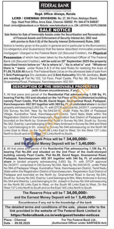 1. All that piece and parcel of the Residential Flat admeasuring 1,198 Sq. Ft. bearing Flat No.103 and situated on the 1st Floor of the multistoried building namely Pearl Castle, Plot No.88, David Nagar, Gnanammal Road, Padappai, Kancheepuram-602 301 together with 369 Sq. Ft. of undivided share in landed property admeasuring 5,663 Sq. Ft. with DTCP approval No. 24/2017, comprised in Old Survey No.544, New Sy No.544/3A1E, under Patta No.584 of Padappai Village, Kundrathur Taluk, Kancheepuram District, Tamil Nadu State within the Registration District of Kancheepuram, Registration Sub District of Padappal and bounded on the North by: Gnanammal Road in Survey No.544, South by. Survey No.542, East by: Land belonging to Mrs. Mary Ambrose in Survey No. 544 and West by: Land belonging to Sri. Joseph in Survey No 544 admeasuring on the North 98 Links East to West, on the South 98 Links East to West, On the West 137 Links North to South and on the East 145 Links North to South