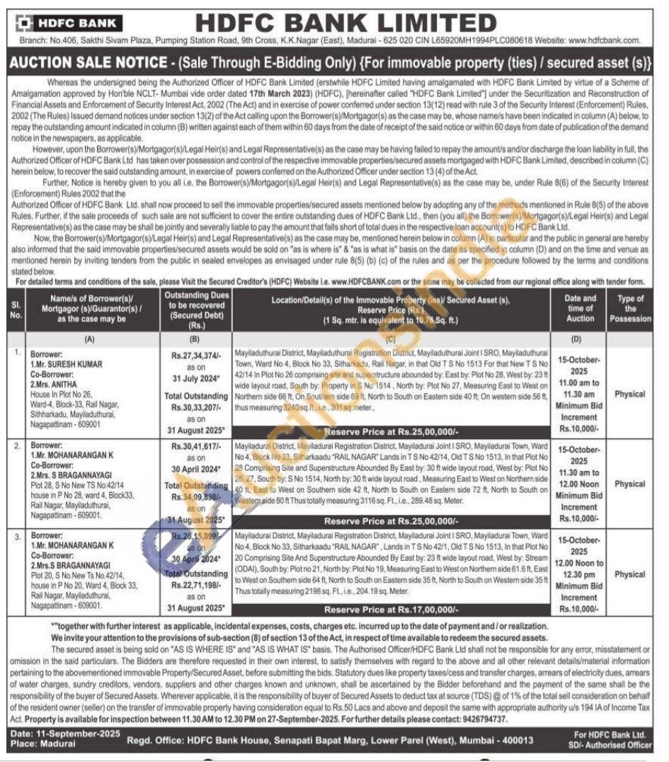 1) Mayiladuthurai District, Mayiladuthurai Registration District, Mayiladuthural Joint ISRO, Mayiladuthurai Town, Ward No 4, Block No 33, Sitharkadu, Rail Nagar, in that Old T S No 1513 For that New T S No 42/14 In Plot No 26 comprising site and superstructure abounded by. East by: Plot No 28. West by: 23 ft wide layout road, South by: Property in S No 1514, North by: Plot No 27, Measuring East to West on Northem side 66 ft. On Southern side 69 ft. North to South on Eastern side 40 ft On western side 50 ft thus measuring 3240 sq.ft, ie, 301 sq meter
