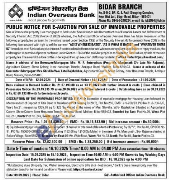 1) EM. & Extension of equitable mortgage for Housing Loan followed by Memorandum of Deposit of Title Deed of Residential Plot bearing Sy 28(P), Plot No 250, CMC 17-5-208/23, PID No.31-6-706-8/C Ward No.31, measuring 1355.76 sq ft (126 Sq Meter) in the name of Mrs. Shivlilla, W/o- Rajshekhar Situated at Agricultural Colony, Shree Colony, Near Hanuman Temple, Amlapur Road, Mailoor, Bider-585403. Bounded by: East: Plot No.05, West: Plot No. 251, North: Plot No. 249, South: 09 Mtr. Wide Road.