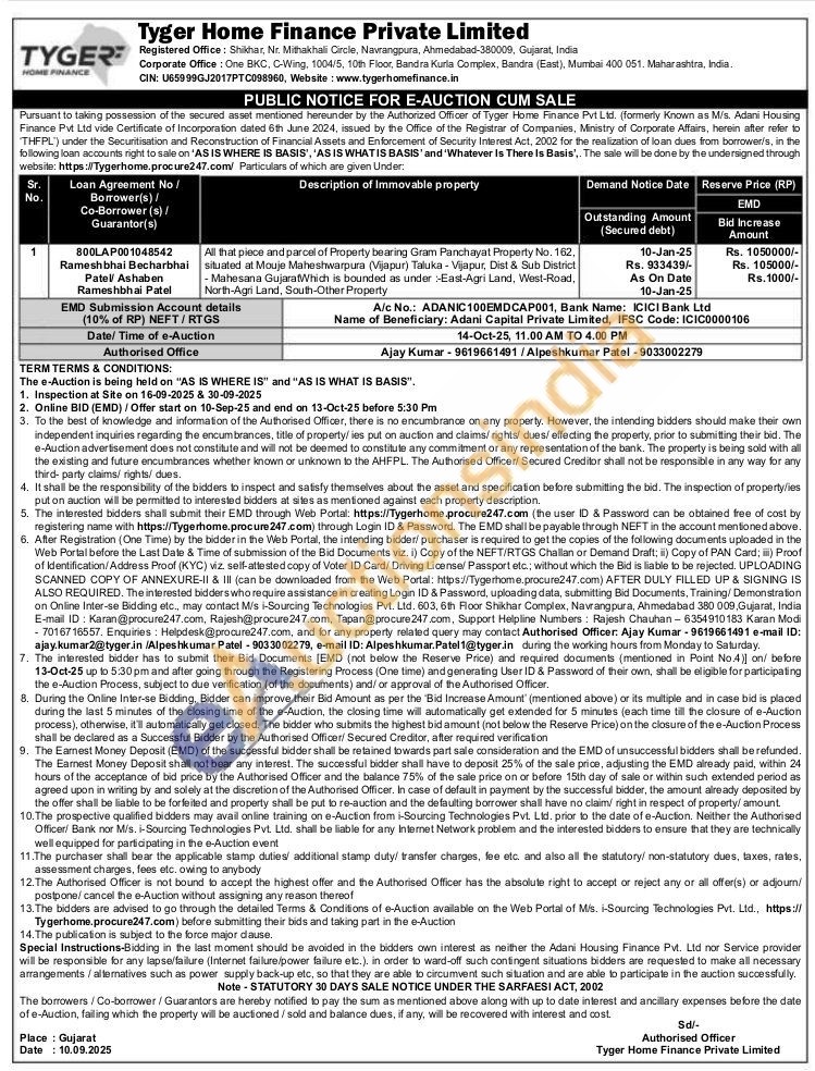 All that piece and parcel of Property bearing Gram Panchayat Property No. 162, situated at Mouje Maheshwarpura (Vijapur) Taluka - Vijapur, Dist & Sub District Mahesana GujaratWhich is bounded as under-East-Agri Land, West-Road, North-Agri Land, South-Other Property