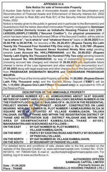 FLAT BEARING NUMBER K243, ADMEASURING ABOUT 34.97 SQUARE METERS OF CARPET AREA (INCLUDING BALCONY) BEARING NUMBER 43 ON THE FOURTH FLOOR IN THE K2 BUILDING OF K-BLOCK IN THE RESIDENTIAL PROJECT KNOWN AS "HAPPINEST BOISAR", CONSTRUCTED ON LAND BEARING NEW GAT NUMBER 50, PLOT NUMBER 1 ADMEASURING 59,334.30 SQUARE METERS, SITUATED AT VILLAGE KAMBALGAON, TALUKA PALGHAR, DISTRICT THANE AND WITHIN THE REGISTRATION DISTRICT OF THANE AND REGISTRATION SUBDISTRICT PALGHAR AND WITHIN THE AREA OF GRAMPANCHAYAT KAMBALGAON, THANE 401501,