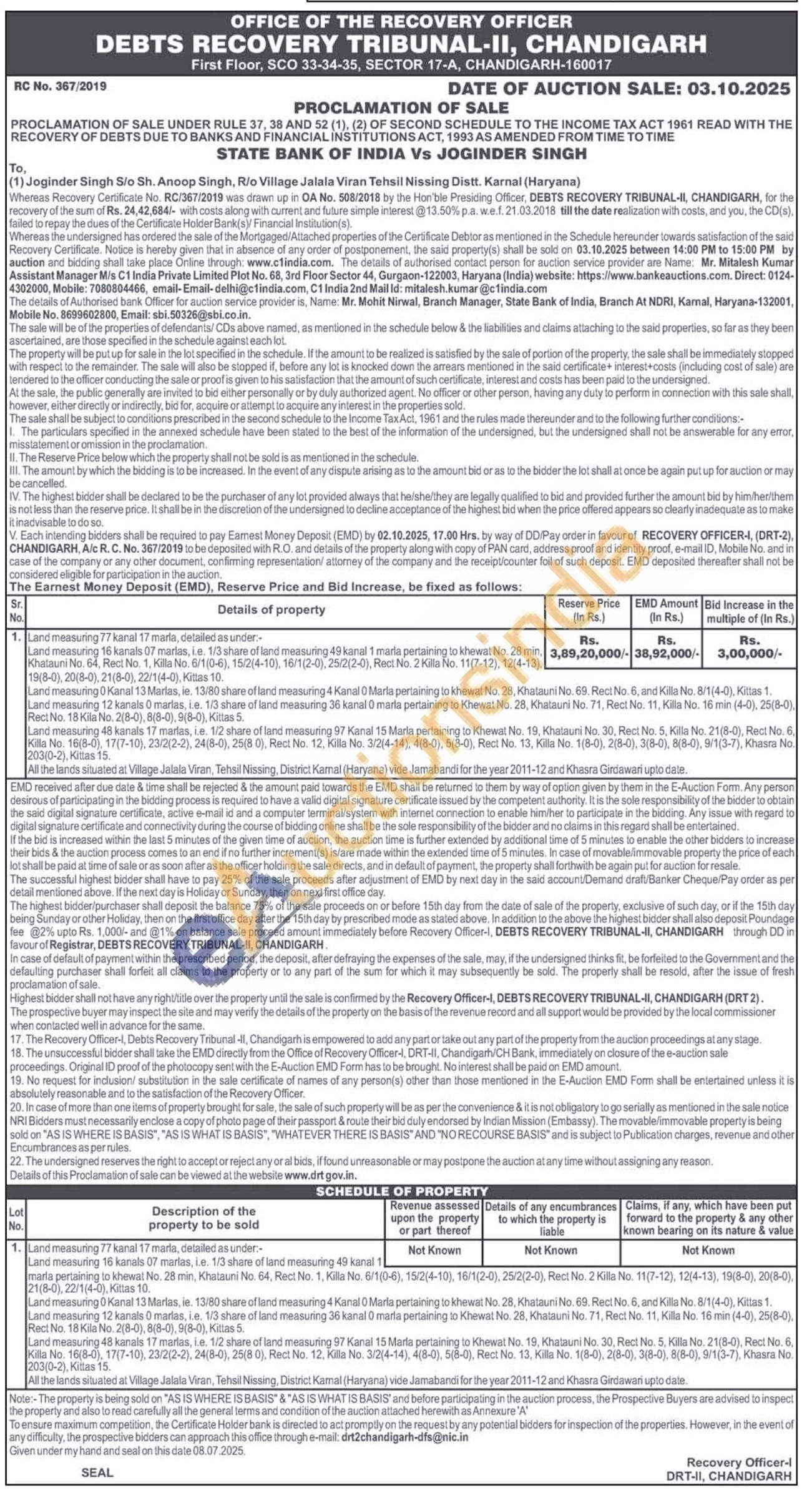 Land measuring 77 kanal 17 marla, detailed as under:-Land measuring 16 kanals 07 marlas, ie. 1/3 share of land measuring 49 kanal 1 maria pertaining to khewat No. 28 min. Khatauni No. 64, Rect No. 1, Killa No. 6/1(0-6), 15/2(4-10), 16/1(2-0), 25/2(2-0), Rect No. 2 Killa No. 11(7-12), 12(4-13), 19(8-0), 20(8-0), 21(8-0), 22/1(4-0), Kittas 10.