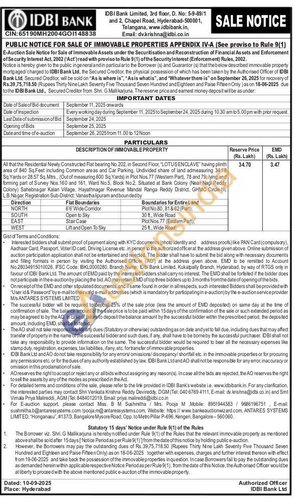 All that the Residential Newly Constructed Flat bearing No. 202, in Second Floor, "LOTUS ENCLAVE" having plinth area of 840 Sq Feet including Common areas and Car Parking, Undivided share of land admeasuring 34.18 Sq. Yards or 28.57 Sq.Mtrs., (Out of measuring 600 Sq. Yards) in Plot Nos.77 (Westem Part), 78 and 79, lying and forming part of Survey Nos. 160 and 161, Ward No.5, Block No.2, Situated at Bank Colony (Near Nagi Reddy Colony) Sahebnagar Kalan Village, Hayathnagar Revenue Mandal Ranga Reddy District, GHMC Cirde-III, L.B. Nagar, Registration Sub-District: Vanastha lipuram and bounded by