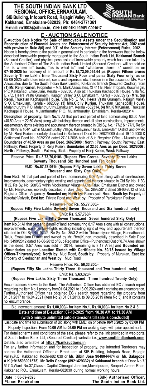All that part and parcel of land admeasuring 8.06 Ares along with all constructions, improvements, easementary rights existing and appurtenant thereon situated in Old Sy. No. 1130/1H/2, Re Sy. No. 208/3/2 within Mookkannur Village, Aluva Taluk, Emakulam District and owned by Mr. RenjiKurien, morefully described in Sale Deed No. 2893/2012 dated 29-06-2012 of Sub Registrar Office-Angamaly. Bounded on; North by: Panchayath Road, South by: Property of KaredathVariyath, East by: Private Road and West by: Property of Parokkaran Paulose