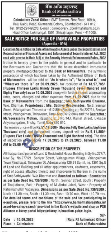 All that part and parcel of Land & Residential House Building in Sy No.277/7. New Sy. No.277/21, Seniyar Street, Valangaiman Village, Valangaiman Town Panchayat, Thiruvarur Dt. Admeasuring 120.91 Sq.mt. Le. 1301 Sq.ft of Land and Building and all other appurtenances, usufructs, easements, right of access attached thereto and improvements thereon in the name of Smt. Sathiyavathi, W/o. Dharmar and Bounded as follows: Boundaries as per Sale Deed No. 736/2009: North Seniyar Street, South: Property of Thajudheen, East: Property of M Abdul Jaleel, West: Property of Rahamathullah Vagaiyara