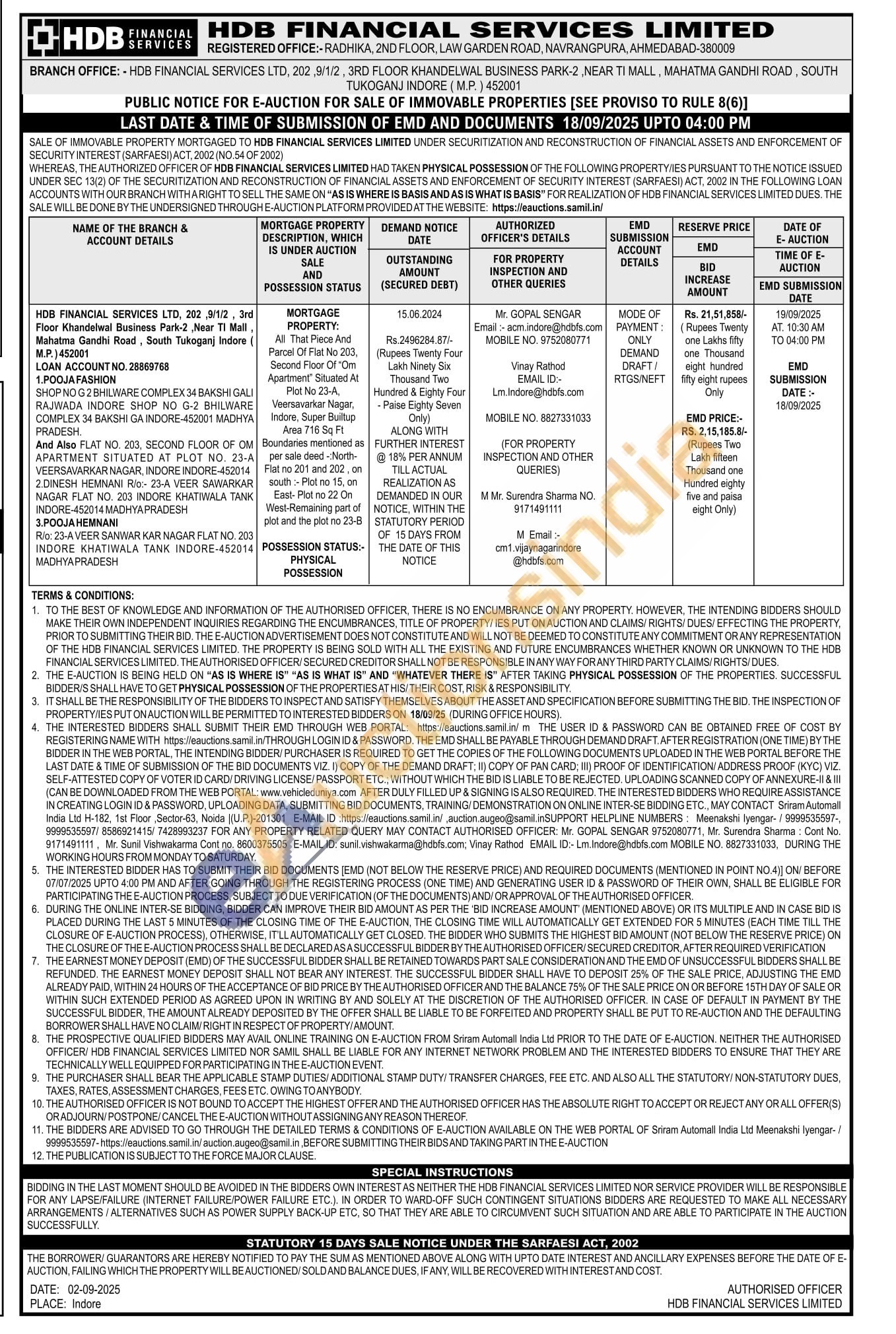 All That Piece And Parcel Of Flat No 203, Second Floor Of "Om Apartment Situated At Plot No 23-A, Veersavarkar Nagar, Indore, Super Builtup Area 716 Sq Ft Boundaries mentioned as per sale deed-North-Flat no 201 and 202, on south: Plot no 15, on East-Plot no 22 On West-Remaining part of plot and the plot no 23-B