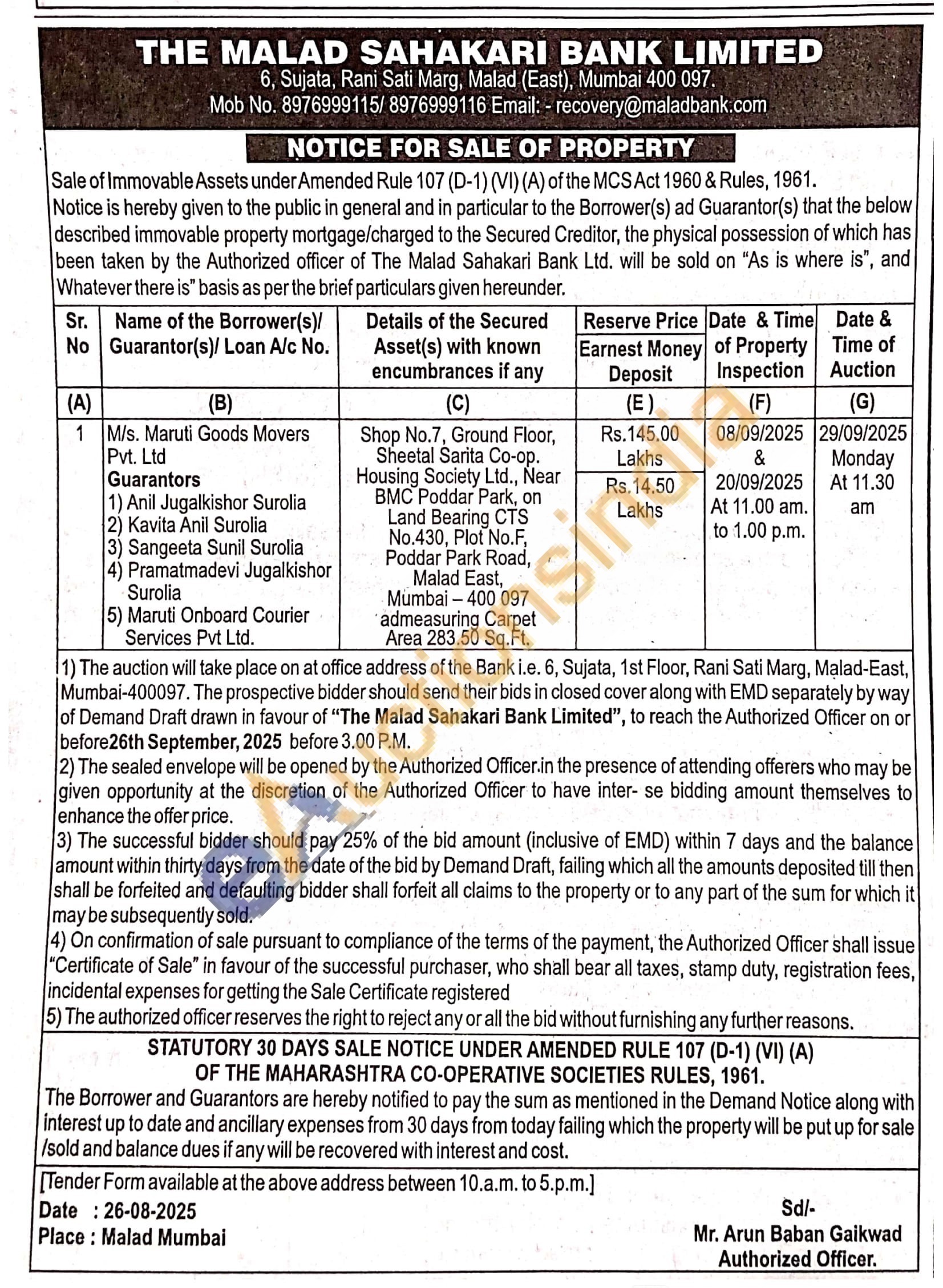 Shop No.7, Ground Floor, Sheetal Sarita Co-op. Housing Society Ltd., Near BMC Poddar Park, on Land Bearing CTS No.430, Plot No.F, Poddar Park Road, Malad East, Mumbai-400 097 admeasuring Carpet Area 283.50 Sq.Ft