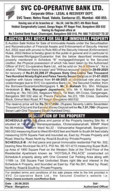 SCHEDULE-A: All that piece and parcel of the Property bearing Site No. 4 situated at 1st Cross, Manarayanapalya, Cholanaiakanahalli, BBMP Ward No.96-Hebbal, Present Ward No.22 Vishwanatha Nagenahalli, Bangalore-560 032 measuring East to West 85+83/2 feet and North to South 64 feet totally measuring 5376 Square Feet and bounded as, East by: Private Property and Road, West by: Road, North by: Road & South by: Private Property