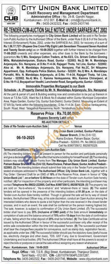 All the part & parcel of Land & Building existing now and construction to be put up thereon in future at T.S. No. 1225, Ward No.5 & Block No.8 situated within Guntur Municipal Corporation Area, Rajas Garden, Guntur City, Guntur Sub-District, Guntur District. Measuring an Extent of 57 819 Sq. Yards within the following boundaries D.No. 11-4-34. East: Chawa Venkayamma, South Road, West. Telagathoti Ramannmma, North: Yerrabothula Subba Reddy