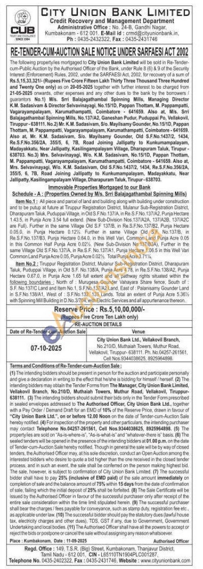 item No.1: All piece and parcel of land and building along with building under construction and to be putup at future at Tiruppur Registration District, Mulanur Sub-Repstraton District, Dharapuram Taluk, Puduppai Village in OldB FNo 137/A in Re S.FNo. 137/A2, Punja Hectare 1435 in in Pu Punja Acre 354 ful extend. (New Sub-Division Nos 137/A2A, 137/A28, 1371A20 ane Ful). Further in the same Vilage Old SF 137/B, in ReS.F.No. 137/82, Purja Hectare 0.06.0, in Punja Hectare 0.125. Further in same Vilage Old SF No.137/8 Re.S.F.No.137/83, Punja Hectare 0.64.6. in this Wiell Vari, Contmon Land Punja Acre 0.05 in this Common Mall Punja Acre 0.02% (New Sub-Division No. 137/83A), Further in the same Village Old S.F.No 1371A, in ReSF. No. 137A1, Purja Hectare 1.06.5 in this Well V Common Land Punja Acre 0.05, Punja Acre 0.02%. Total Punja Acre 3.71% Item No.2: Truppur Registration District, Mulanur Sub-Registration District, Dharapuram Taluk, Puduppai Village, in Old SF. in Old S.F. No.138A, Punja Acre 4.76, in Re.S.FNo.138/A2, Punja Hectare 0.67.0, in Punja Acre 1.65 full extent and all pathway rights situated within the following boundaries North of Murugesa Gounder Vahayara Share fence. South of 8.F. No. 137/C Land and Item hio. 1, SF.No. 137/A2 Land East of Palanisamy Gounder Land in S.FNo. 138/A1, West of SFNo 132 133 Lands. Total an extent of Punja Acre 5.36% with Spinning Mill Building in D No.3/704, with Electric Services and all appurtenance thereon.