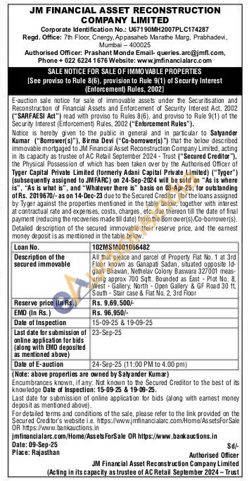 All that pieace and parcel of Property Flat No. 1 at 3rd Floor known as Ganapati Sadan, situated opposite Id-gaah Bhawan, Nethelav Colony Baswara 327001 meas-uring approx 700 Sqft. Bounded as East Plot No. 8, West Gallery, North Open Gallery & GF Road 30 11 South Stair case & Flat No. 2, 3rd Floor