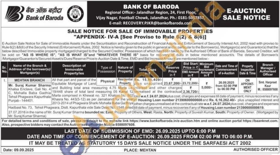 All that part and parcel of the Equitable Mortgage of Land and Building total area measuring 4.75 Marla Le 19/448 share of total land measuring 05 Kanal 12 Marla comprised in Khewat no. 321 Khatoni No. 502 Khasra No. 443(5-12) as per Jamabandi for the year 2013-2014 of Phagwara Sharki Mohalla Baba Gadhiya Hadbast No. 73. Tehsil Phagwara, Distt. Kapurthala vide Sale Deed No. 1548 dated 27.07.2016 in the name of Mr. Suraj Kumar Sharma bounded as: East: Property of Others, West: Rasta, North: Property of Suvesh Kumar, South: Property of Owner. (Mortgaged by Mr. Suraj Kumar Sharma)