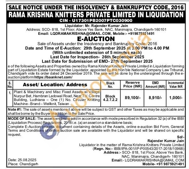 Plant & Machinery and Misc Fixed Assets at Village Nurpur Bet, Hambran Ladowal Road, Near T.V. Centre Building, Ludhiana One (1) No. Circular Knitting Machine-Brand-Wellknit, Taiwan