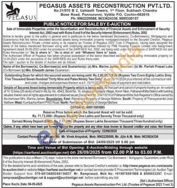 Details of Secured Asset being Immovable Property which is being sold: All that part and parcel of property having an An extent of 10.12 Ares (25 cents) of land in Re Sy. No. 454/2, Block No. 16, situated at Mallapra Village, Konni Taluk, Pathanamthitta District with building situates therein and all rights appurtenant to it obtained as per Document No. 2047/2016 of Pathanamthitta Sub Registrar's Office owned by the borrower Mrs. Marina James Boundaries; East: Remaining Property of George Mathew, South: Property of Thevuparambil Jose Mathew; West: Kumbazha-Ranni PWD Road: North: Remaining Property of George Mathew