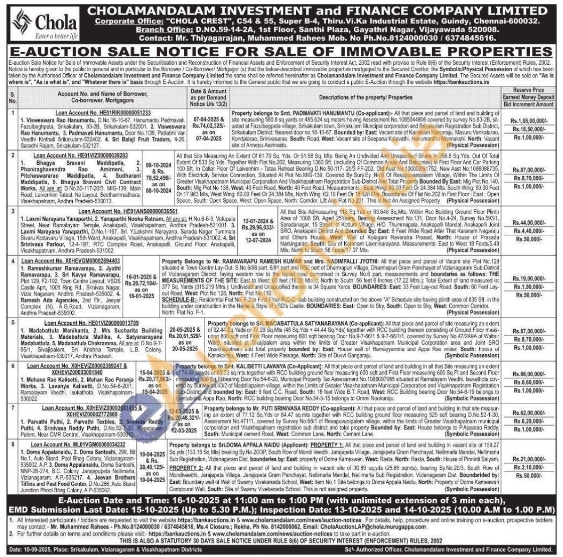 Property belongs to Smt. PADMAVATI HANUMANTU (Co-applicant): All that piece and parcel of land and building of site measuring 580 8 sq yards or 485.624 sq. meters having Assessment No. 1085044806 covered by survey No.83-2B, sit-uated at Fazulbegpeta village, Srikakulam town, Srikakulam Muncipal corporation and Srikakulam Registration Sub District, Srikakulam District: Nearest door no. 16-10-57. Bounded by: East: Vacant site of Kanakam Kamaraju, Mavuru Venkatarao. Kondalarao, Srinivasarao. South: Road, West: Vacant site of Seepana Kalavathi, Hanumanthu Meenakshi, North: Vacant site of Annepu Asirinaidu.