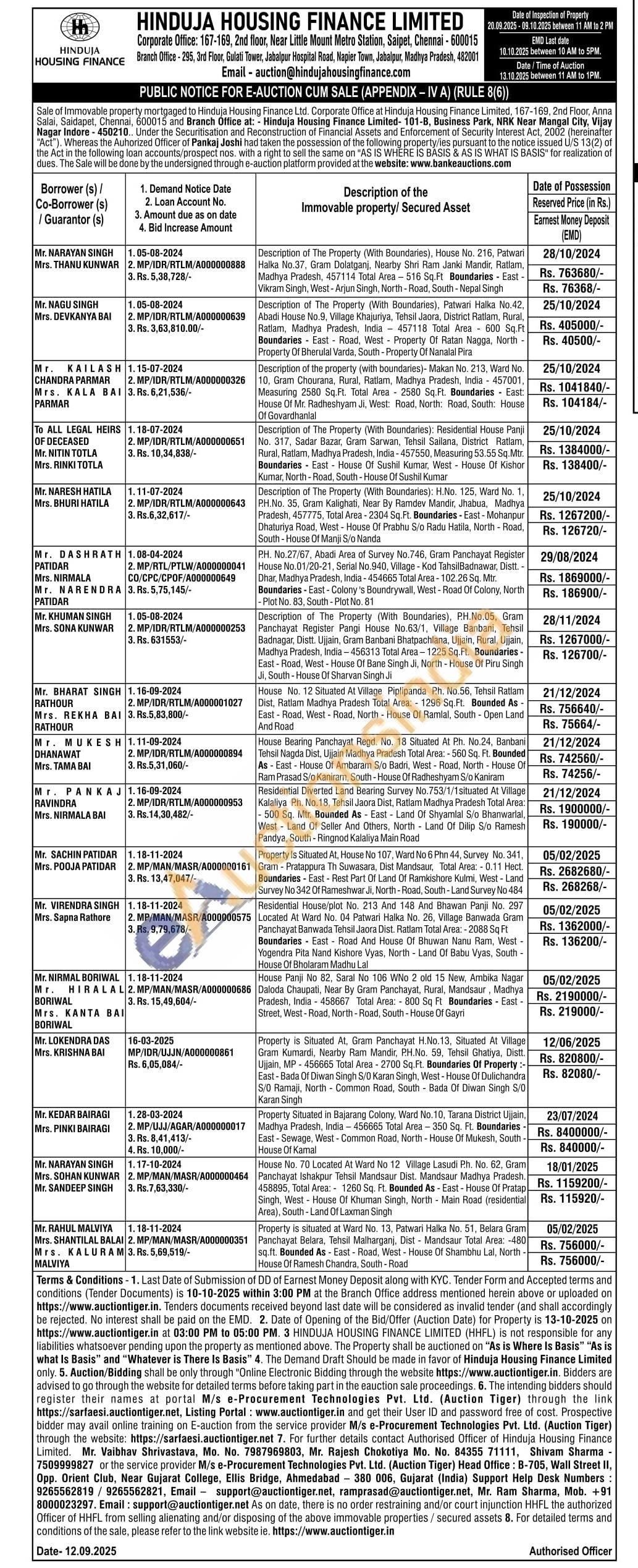 Contact Authorised Officer of Hinduja Housing Finance Limited. Mr. Vaibhav Shrivastava, Mo. No. 7987969803, Mr. Rajesh Chokotiya Mo. No. 84355 71111, Shivam Sharma 7509999827