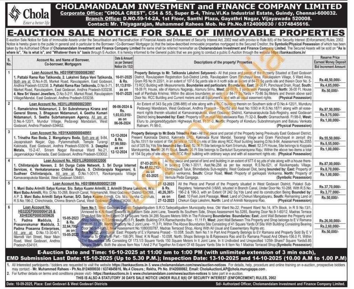 Property Belongs to Mr.Boda Trinadha Rao:-All that piece and parcel of the Property being Previously East Godavari District, Present Kakinada District, Kakinada SRO, Kakinada Rural Mandal, Toorangi Vilage and Gram Panchayat in zeroyit dry Sy.No.151/1 for extent of 154 Sq yds or 129.6 Sq.mts of Site along RCC Roof building bearing D.No.9-84, Assessment No.2055 out of 325 Sq. Yds Site bounded by:- East: 52.06 Ft Site belongs to Kami Sriramulu, West: 52.3 Ft House, Site belongs to Koppala Manikyamba, North: 26 Ft Road, South: 26 Ft Site belongs to Dantuluri Suryanarayana Raju; Within the above two items a total of 154 Sq.yds of site along with RCC Roof building with ordinary ways and with all easement rights etc. (Physical Possession)