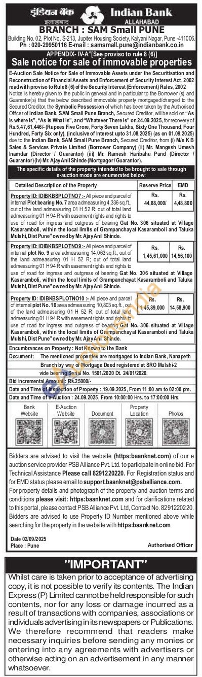 Property ID: IDIBKBSPLOTNO9:- All piece and parcel of internal plot No. 9 area admeasuring 14,063 sq.ft., out of the land admeasuring 01 H 52 R; out of total land admeasuring 01 H94 R with easementrights and rights to use of road for ingress and outgress of bearing Gat No. 306 situated at Village Kasaramboli, within the local limits of Grampanchayat Kasaramboli and Taluka Mulshi, Dist Pune" owned by Mr. Ajay Anil Shinde