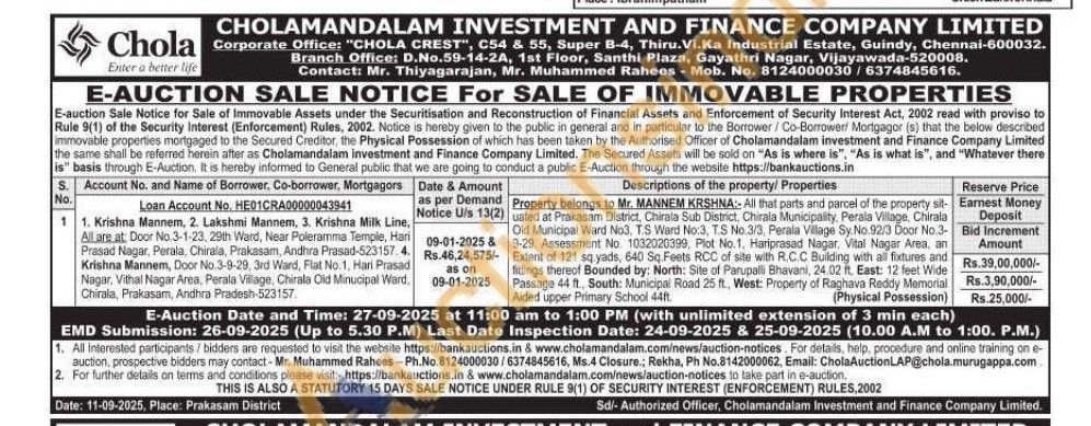 Property belongs to Mr. MANNEM KRSHNA:- All that parts and parcel of the property sit-uated at Prakasam District, Chirala Sub District, Chirala Municipality, Perala Village, Chirala Old Municipal Ward No3, T.S Ward No:3, T.S No.3/3, Perala Village Sy. No. 92/3 Door No.3-9-29. Assessment No. 1032020399, Plot No.1, Hariprasad Nagar, Vital Nagar Area, an Extent of 121 sq yads, 640 Sq. Feets RCC of site with R.C.C Building with all fixtures and Extent of 121 sq yads, 640 Sq. Feets RCC of site with R.C.C Building with all fixtures and 44 ft. South: Municipal Road 25 ft., West: Property of Raghava Reddy Memorial Aided upper Primary School 44ft