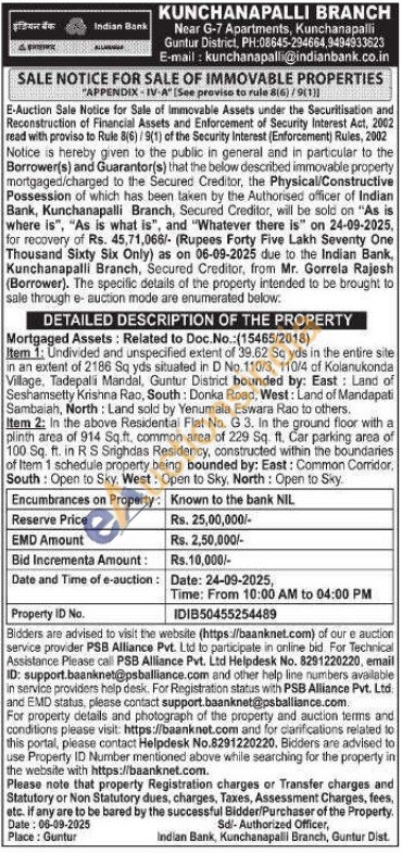 Item 1: Undivided and unspecified extent of 39.62 Sq yds in the entire site in an extent of 2186 Sq yds situated in D No. 110/3, 110/4 of Kolanukonda Village, Tadepalli Mandal, Guntur District bounded by: East: Land of Seshamsetty Krishna Rao, South: Donka Road, West: Land of Mandapati Sambaiah, North: Land sold by Yenumala Eswara Rao to others.