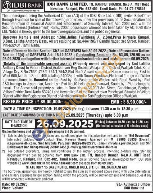 Details of the immovable secured assets) (Property owned and mortgaged by Smt Lalitha Anthony Dass) In Vellore District, Arakkonam Reg District, Walajah Sub District, Walajah Taluk, Karai Village Dry S.No. 753/1,753/2,754/1,754/2, Plot No.9, Vacant site and a House measuring East to West 60ft, North to South 40ft, totaling 2400Sq.ft.with Doors, Windows, Electrical fittings and Water tap connections etc. Bounded on the: East by: 9mEastern side Western side Road, West by: Plot 2&3 belongs to Jayaraman, North by: Plot No.10 belongs to Gnanavel, South by Plot belongs to Ismail, The Above said property situates in Door No: 44A/19C/1,3rd Street, Gandhinagar, Ranipet, Vellore District, Tamil Nadu-632401 and in ward No.B of the Ranipet town Panchayat. Situated in Vellore District within the Registration District of Arakkonam and in Sub Registration Office of Walajah