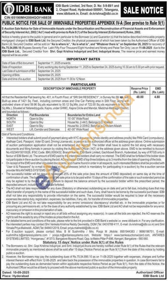All that the Residential Flat bearing No. 401, in Fourth Floor, of 'SRI SAI RESIDENCY", in Survey No.58/D, with Built-up area of 1421 Sq. Feet, including common areas and One Car Parking area in Stilt Floor, along with undivided share of land 59.96 Sq.yds equivalent to 50.12 Sq.Mts, (out of 722.00 Sq.yds equivalent to 603.59 Sq.Mts.), Situated at Yellareddyguda, Kapra, under GHMC, Kapra Circle and Mandal, Medchal-Malkajgiri District, and bounded as follows-