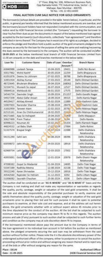 HDB Financial Services Limited Gold Auctions Auction in New Delhi