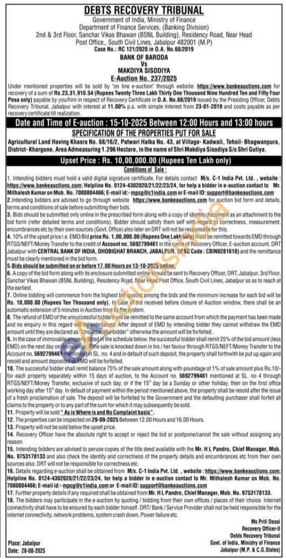 Agricultural Land Having Khasra No. 68/16/2, Patwari Halka No. 43, at Village-Kadwali, Tehsil-Bhagwanpura, District-Khargone, Area Admeasuring 1.296 Hectare, in the name of Shri Makdiya Sisodiya S/o Shri Gutiya