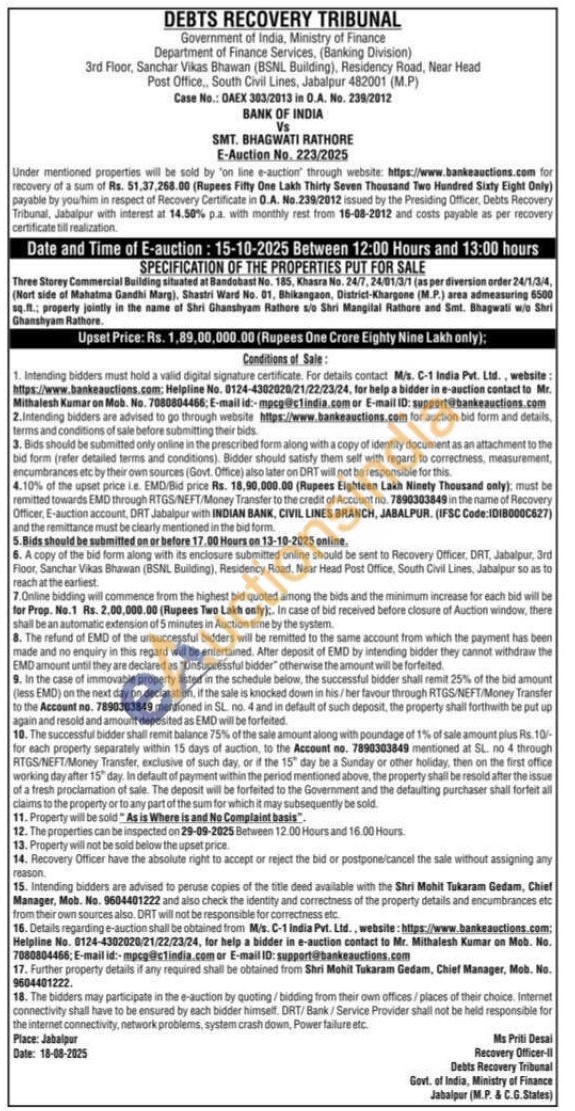Three Storey Commercial Building situated at Bandobast No. 185, Khasra No. 24/7, 24/01/3/1 (as per diversion order 24/1/3/4, (Nort side of Mahatma Gandhi Marg), Shastri Ward No. 01, Bhikangaon, District-Khargone (M.P.) area admeasuring 6500 sq.ft.; property jointly in the name of Shri Ghanshyam Rathore s/o Shri Mangilal Rathore and Smt. Bhagwati w/o Shri Ghanshyam Rathore