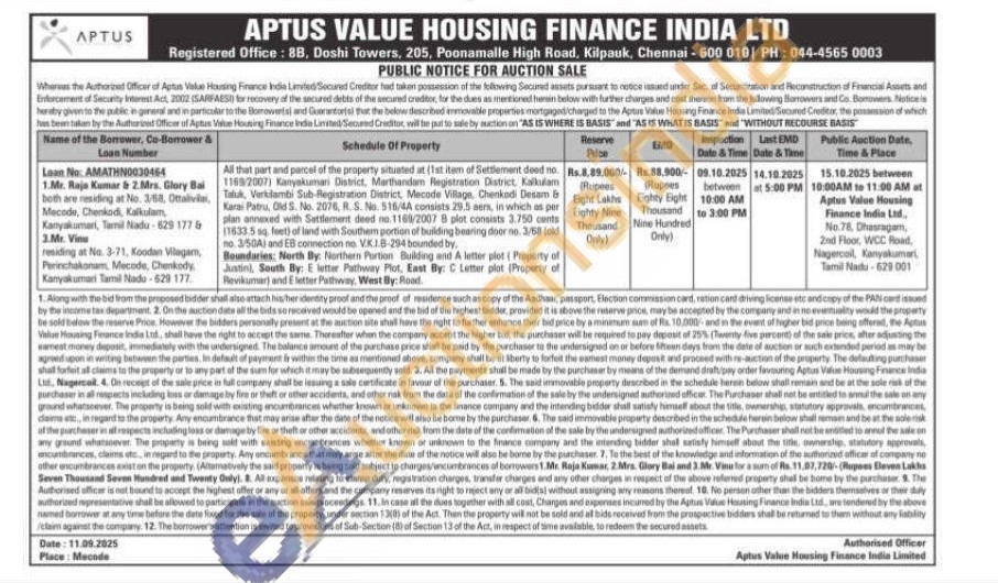 All that part and parcel of the property situated at (1st item of Settlement deed no. 1168/2007) Kanyakumari District, Marthandam Registration District, Kalkulam Tak Verkilambi Sub-Registration District, Mecode Village, Chenkodi Desame Karai Patru, Old S. No. 2076, R. S. No. 516/4A consists 29.5 aers, in which as per plais annexed with Settlement deed no.1160/2007 8 plot consists 3.750 cents 176335 sq. feet) of land with Southem portion of building bearing door no. 3/58 (old no. 3/50A) and EB connection no. VK1B-294 bounded by.