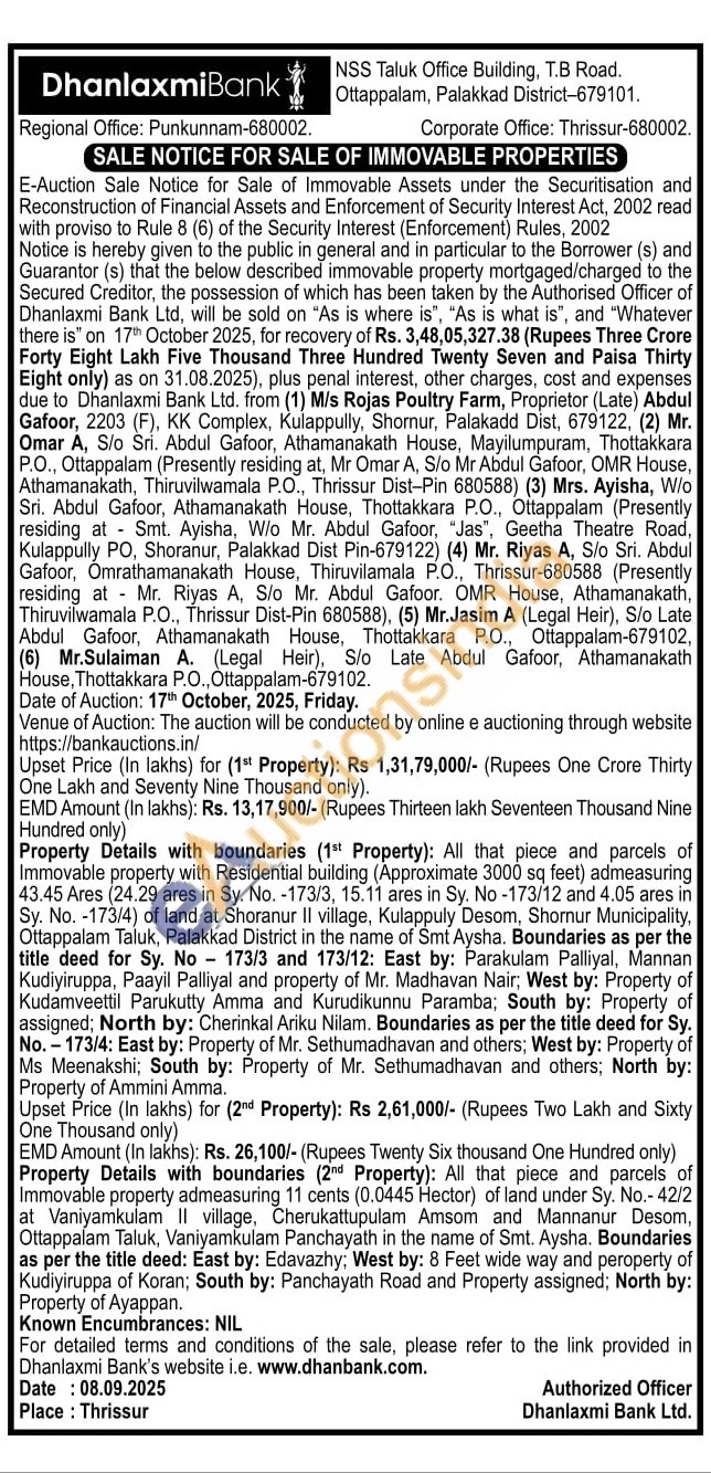 Property Details with boundaries (1st Property): All that piece and parcels of Immovable property with Residential building (Approximate 3000 sq feet) admeasuring 43.45 Ares (24.29 ares in Sy. No. -173/3, 15.11 ares in Sy. No -173/12 and 4.05 ares in Sy. No. -173/4) of land at Shoranur II village, Kulappuly Desom, Shornur Municipality, Ottappalam Taluk, Palakkad District in the name of Smt Aysha. Boundaries as per the title deed for Sy. No 173/3 and 173/12: East by: Parakulam Palliyal, Mannan Kudiyiruppa, Paayil Palliyal and property of Mr. Madhavan Nair, West by: Property of Kudamveettil Parukutty Amma and Kurudikunnu Paramba; South by: Property of assigned; North by: Cherinkal Ariku Nilam. Boundaries as per the title deed for Sy. No.173/4: East by: Property of Mr. Sethumadhavan and others; West by: Property of Ms Meenakshi; South by: Property of Mr. Sethumadhavan and others; North by: Property of Ammini Amma.