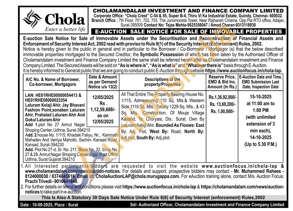 All That Entire The Property Bearing House No. 1/115, Admeasuring 110 Sq. Mts.& Western Side 1119 Sq. Mts., Totlally 1229 Sq. Mts., & 43 Sq. Mts., Construction, Of Mouje Village Kansad, Ta: Choryasi, Dis.: Surat. Own By Laluram Kelaji Ahir. Bounded As Floows: East By: Adj. Plot, West By: Road, North By: Adj.plot, South By: Adj.plot