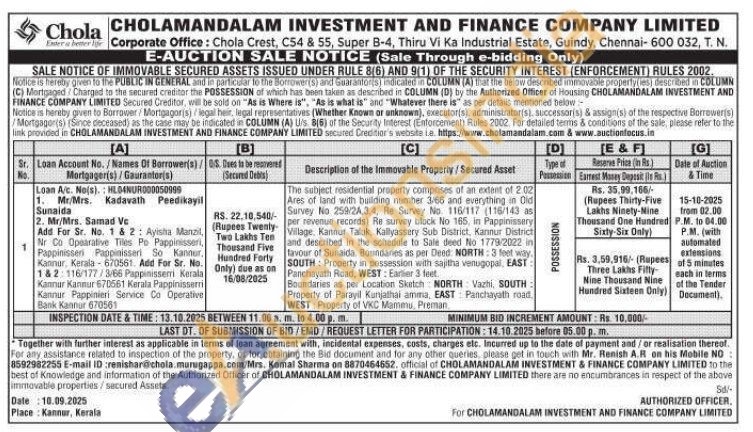 The subject residential property comprises of an extent of 2.02 Ares of land with building number 3/66 and everything in Old Survey No 259/24.3.4, Re Survey No. 116/117 (116/143 as per revenue records) Re survey block No 165, in Pappinissery Village, Kannur Taluk, Kallyassery Sub District, Kannur District and described in the schedule to Sale deed No 1779/2022 in favour of Sunaida, Boundanes as per Deed: NORTH: 3 feet way. SOUTH: Property in possession with sajitha venugopal, EAST: Panchayath Road, WEST: Eanier 3 feet Boundaries as per Location Sketch NORTH Vazhi, SOUTH: Property of Parayıl Kunjalhai amıma, EAST Panchayath road WEST Property of VKC Mammu, Preman