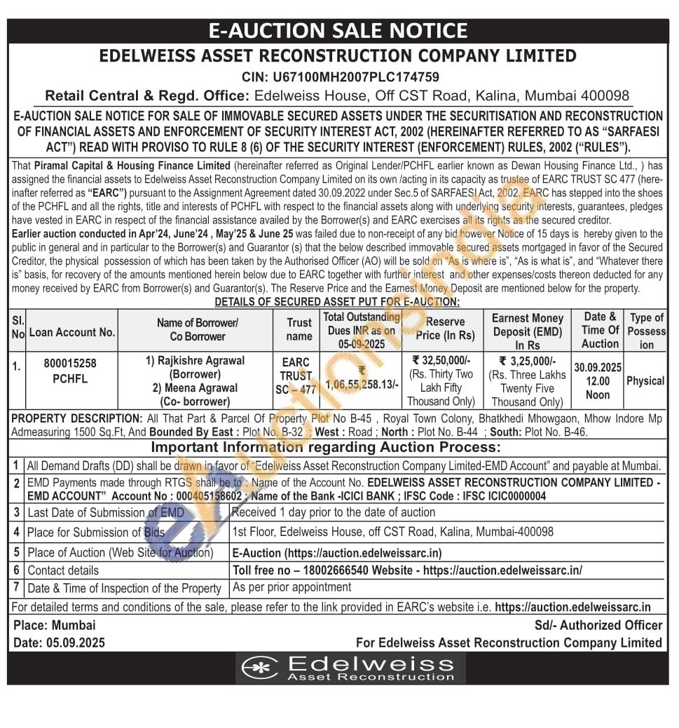 PROPERTY DESCRIPTION: All That Part & Parcel Of Property Plot No B-45, Royal Town Colony, Bhatkhedi Mhowgaon, Mhow Indore Mp Admeasuring 1500 Sq.Ft, And Bounded By East: Plot No. B-32; West: Road North: Plot No. B-44; South: Plot No. B-46.