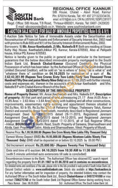 Name of Property Owner: Mr. Ansar Keethadath and Mrs. Naleefa BP, Description of property: All that part and parcel of land admeasuring 21.17 Ares (4.05 Ares + 10.85 Ares + 2.63 Ares +3.64 Ares) along with building and all other constructions, improvements, easementary rights existing and appurtenant thereon situated in Old Sy.Nos. 93 & 95, Re.Sy. No. 27/1 of Pattannur Village, Thalassery Taluk, Kannur District and owned by Ansar Keethadath, morefully described in Registered Jenmam Assignment Deed No. 2389/2015 dated 28-11-2015, Registered Jenmam Assignment Deed No. 2485/2015 dated 14-12-2015, and Registered Jenmam Assignment Deed No. 2513/2015 dated 17-12-2015, all of Sub Registrar Office -Irikkur. BOUNDARIES: North: Road, South: Property of Sareena, Shamsudheen and Abida, East: Property of Salim, Abida and Shamsudheen, West: Property of Mural.