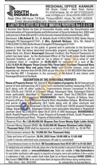 Name of Property Owner: Mr. Ashraf B. Description of property: A) All that part and parcel of land admeasuring 29.5 Cents with residential building measuring 6452.10 sq.ft along with all other usufructs, improvements thereon comprised in Re.Sy Nos. 129/2A and 129/28 of Chengala Village, Kasaragod Taluk, Kasaragod District more particularly described in Registered Jenmam Deed No.2788/2016 dated 04.07.2016 of SRO Kasaragod. BOUNDARIES: North: Property of Sidique, East Property of Riyas, South: Common Road & West: Aboobakker Sidique. B) All that part and parcel of land admeasuring 38.5 Cents along with all other usufructs and improvements thereon comprised in Re. Sy Nos. 129/2A and 129/28 situated Chengala Village, Kasaragod Taluk, Kasaragod District more particularly described in Registered Jenmam Deed No.2788/2016 dated 04.07.2016 of SRO Kasaragod. BOUNDARIES: North: Road & Property of Riyas, East: Property of Suharabi & Road, South: Property of Muhammed Kunhi and West: Property of Aboobakker Sidique.