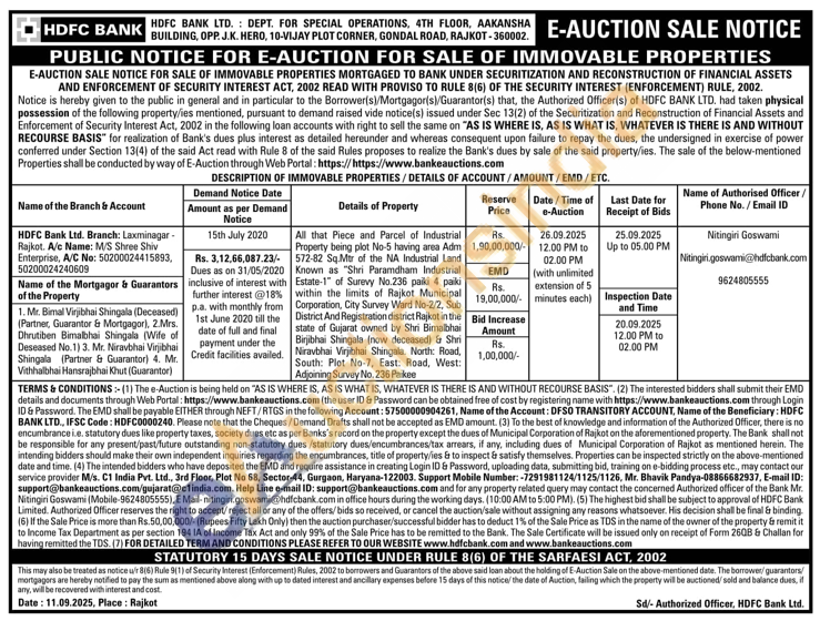 Contact Mobile Number:-7291981124/1125/1126, Mr. Bhavik Pandya-08866682937, E-mail ID: support@bankeauctions.com/gujarat@clindia.com. Help Line e-mail ID: support@bankeauctions.com