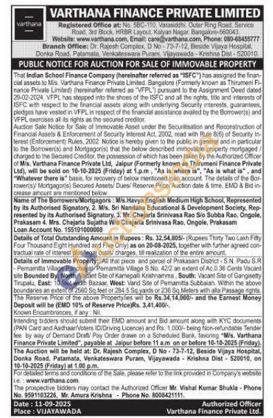 Details of Immovable Property: All that piece and parcel of Prakasam District-S.N. Padu 8.R Pemamitta Village Panchayat- Pernamitta Village S. No. 42/2 an extent of Ac 0.38 Cents Vacant sile Bounded By: North: Vacant Site of Kamepali Kristyiamma, South: Vacant Site of Gangiselty Tirupalu, East: 10 feet width Bazaar, West: Vand Site of Pemamitta Subbaiah. Within the above boundaries an extent of 2560 So feet or 284.5 Sq yards or 236 Sq. Meters with alla Passage nights