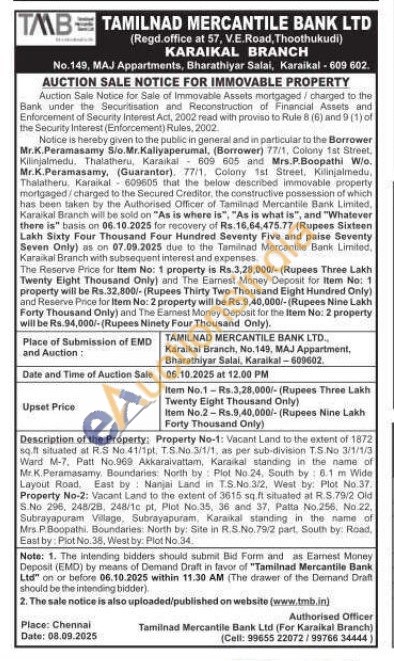 Property No-2: Vacant Land to the extent of 3615 sq ft situated at R.S.79/2 Old S.No 296, 248/28, 248/10 pl, Plot No.35. 36 and 37, Patta No.256. No 22. Subrayapuram Village, Subrayapuram, Karaikal standing in the name of Mrs. PBoopalhi. Boundaries: North by: Site in R.S.No. 79/2 part, South by: Road, East by: Plot No.38, West by: Plot No.34