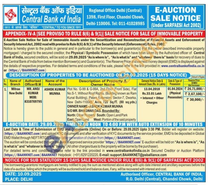 Plot No. G-99 & G-99A, 2nd Floor (Front Side), Flat No.S-1, Without Roof Rights, (Building known as Ram Kunal Building), Palam Extension, Sector-7, Dwarka, New Delhi-110045. Area 720 Sq.fT. (80 sq.yds.) OWNER NAME-ASHOK KUMAR MUNNA S/O MR. BHAGWAN DAS. Bounded By: North: Other Property South: Open Land/Park East: Open Land West: Portion of the said property