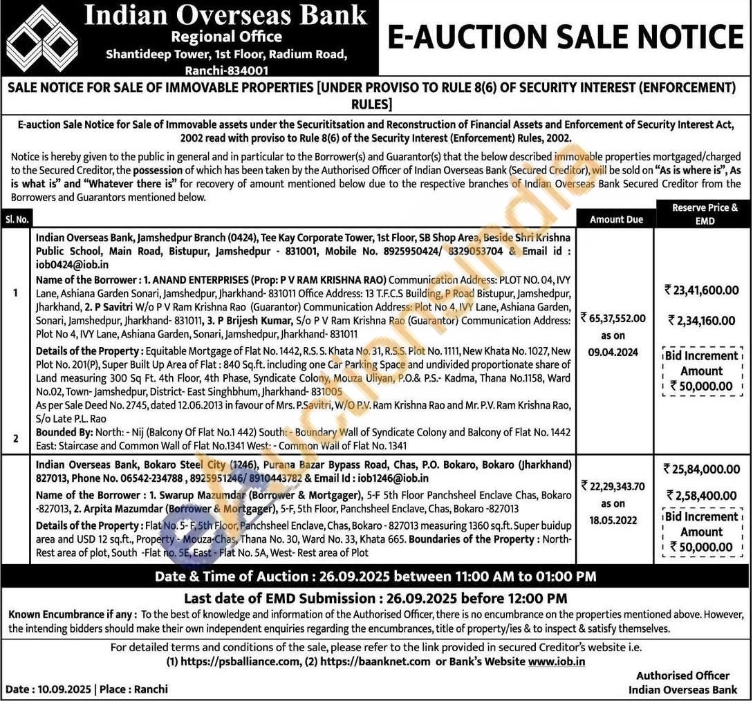 Details of the Property: Flat No. 5-F, 5th Floor, Panchsheel Enclave, Chas, Bokaro - 827013 measuring 1360 sq.ft. Super buidup area and USD 12 sq.ft., Property - Mouza-Chas, Thana No. 30, Ward No. 33, Khata 665. Boundaries of the Property: North-Rest area of plot, South -Flat no. 5E, East - Flat No. 5A, West- Rest area of Plot