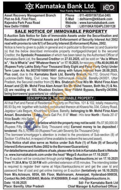 All that Part and Parcel of Residential Property on Plot Nos. 101 & 102, totally measuring 85.93 Sq.mtr. together with building constructed thereon at Khasra No.334, Colony Road, Jagatpur Lala Begum, Khushboo Enclave, Bareilly, belonging to Mr. Mohd Firoz Alam Ansari. Boundaries: East: Rasta Gali Pvt. 9-0 West: Hio Israr North: Rasta 20-0 Wide South: Hio Seller