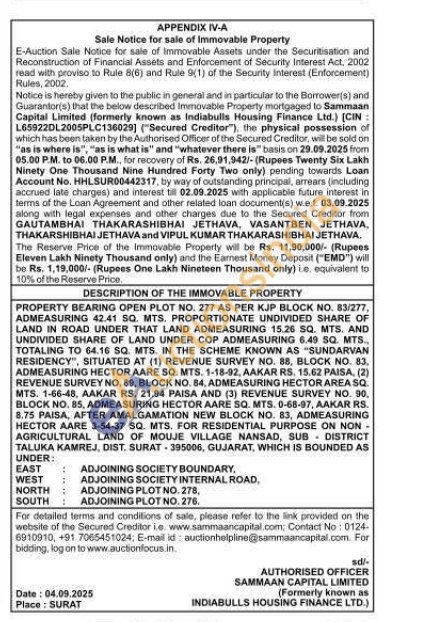 PROPERTY BEARING OPEN PLOT NO. 277 AS PER KJP BLOCK NO. 83/277, ADMEASURING 42.41 SQ. MTS, PROPORTIONATE UNDIVIDED SHARE OF LAND IN ROAD UNDER THAT LAND ADMEASURING 15.26 SQ. MTS. AND UNDIVIDED SHARE OF LAND UNDER COP ADMEASURING 6.49 SQ. MTS.. TOTALING TO 64.16 SQ. MTS. IN THE SCHEME KNOWN AS "SUNDARVAN RESIDENCY", SITUATED AT (1) REVENUE SURVEY NO. 88, BLOCK NO. 83, ADMEASURING HECTOR AARE SQ. MTS. 1-18-92, AAKAR RS. 15.62 PAISA, (2) REVENUE SURVEY NO. 89, BLOCK NO. 84, ADMEASURING HECTOR AREA SQ. MTS. 1-66-48, AAKAR RS. 21.94 PAISA AND (3) REVENUE SURVEY NO. 90, BLOCK NO. 85, ADMEASURING HECTOR AARE SQ. MTS. 0-68-97, AAKAR RS. 8.75 PAISA, AFTER AMALGAMATION NEW BLOCK NO. 83, ADMEASURING HECTOR AARE 3-54-37 SQ. MTS. FOR RESIDENTIAL PURPOSE ON NON-AGRICULTURAL LAND OF MOUJE VILLAGE NANSAD, SUB TALUKA KAMREJ, DIST. SURAT-395006, GUJARAT, WHICH IS BOUNDED AS UNDER: EAST WEST ADJOINING SOCIETY BOUNDARY, ADJOINING SOCIETY INTERNAL ROAD, ADJOINING PLOT NO. 278, NORTH SOUTH: ADJOINING PLOT NO. 276